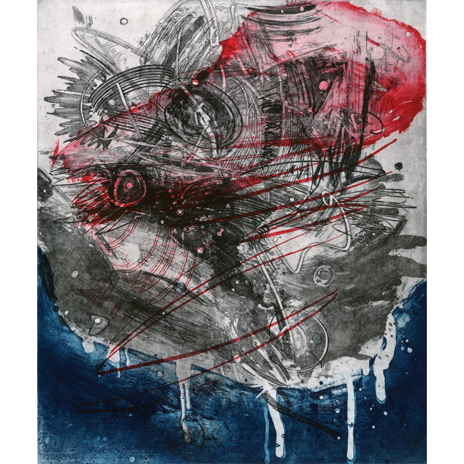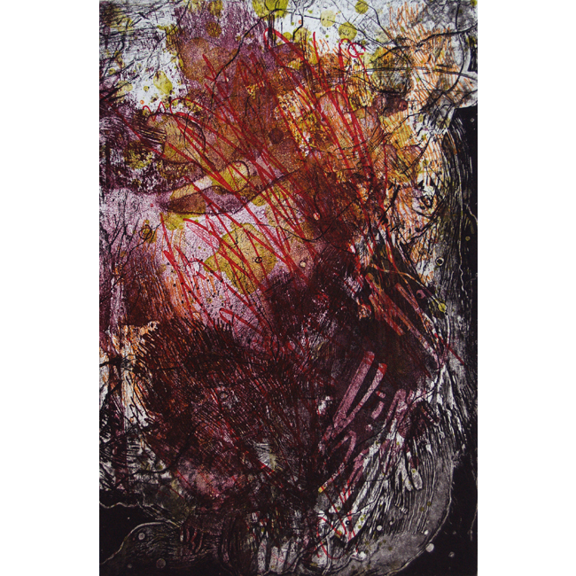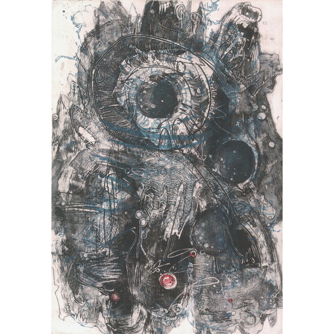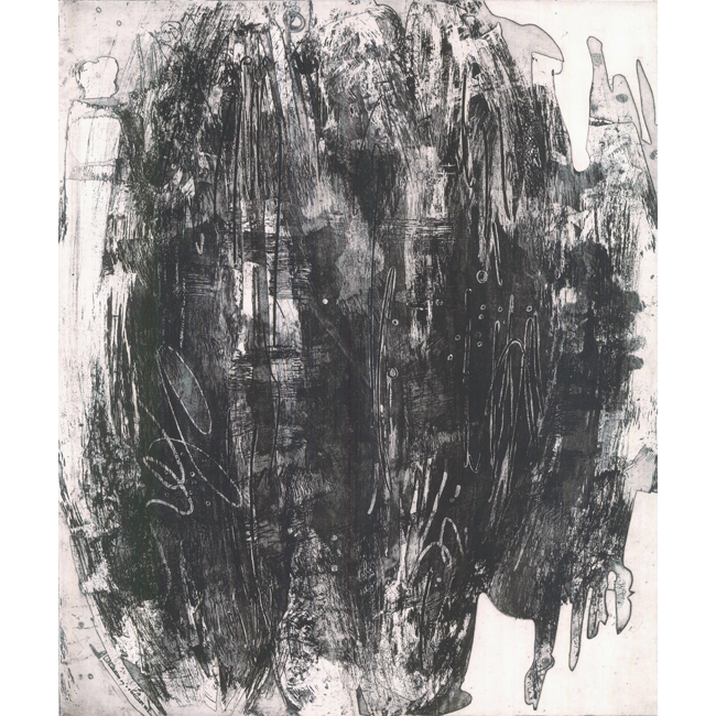 L'utilizzo di tutti questi segni pregnano la composizione di caratterizzanti sfumature e la espandono nella sua gamma dal nero al grigio, creando piani su cui si avviluppa la plasticità dell'immagine e rivela la scoperta di un nuovo mondo interiore che scorre nel profondo e denso fluido dell'Es Freudiano.